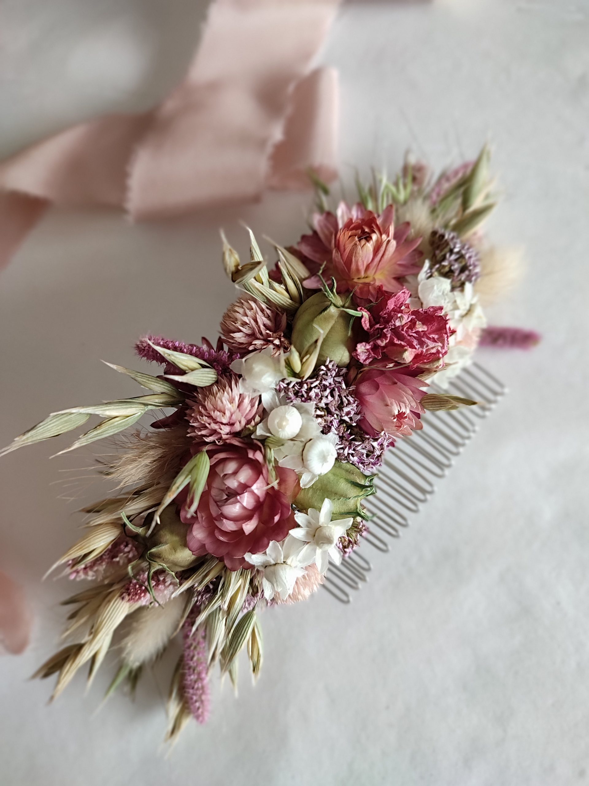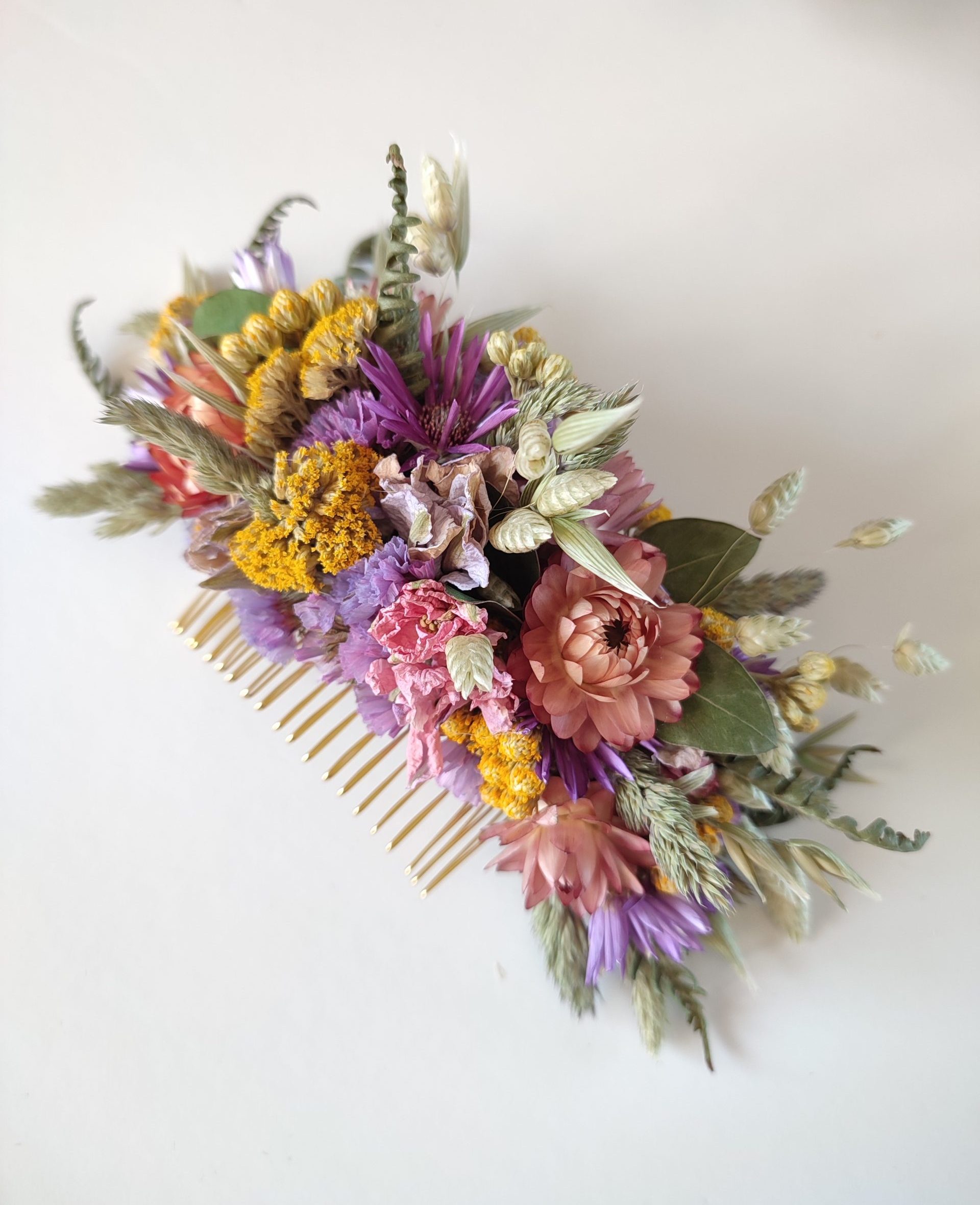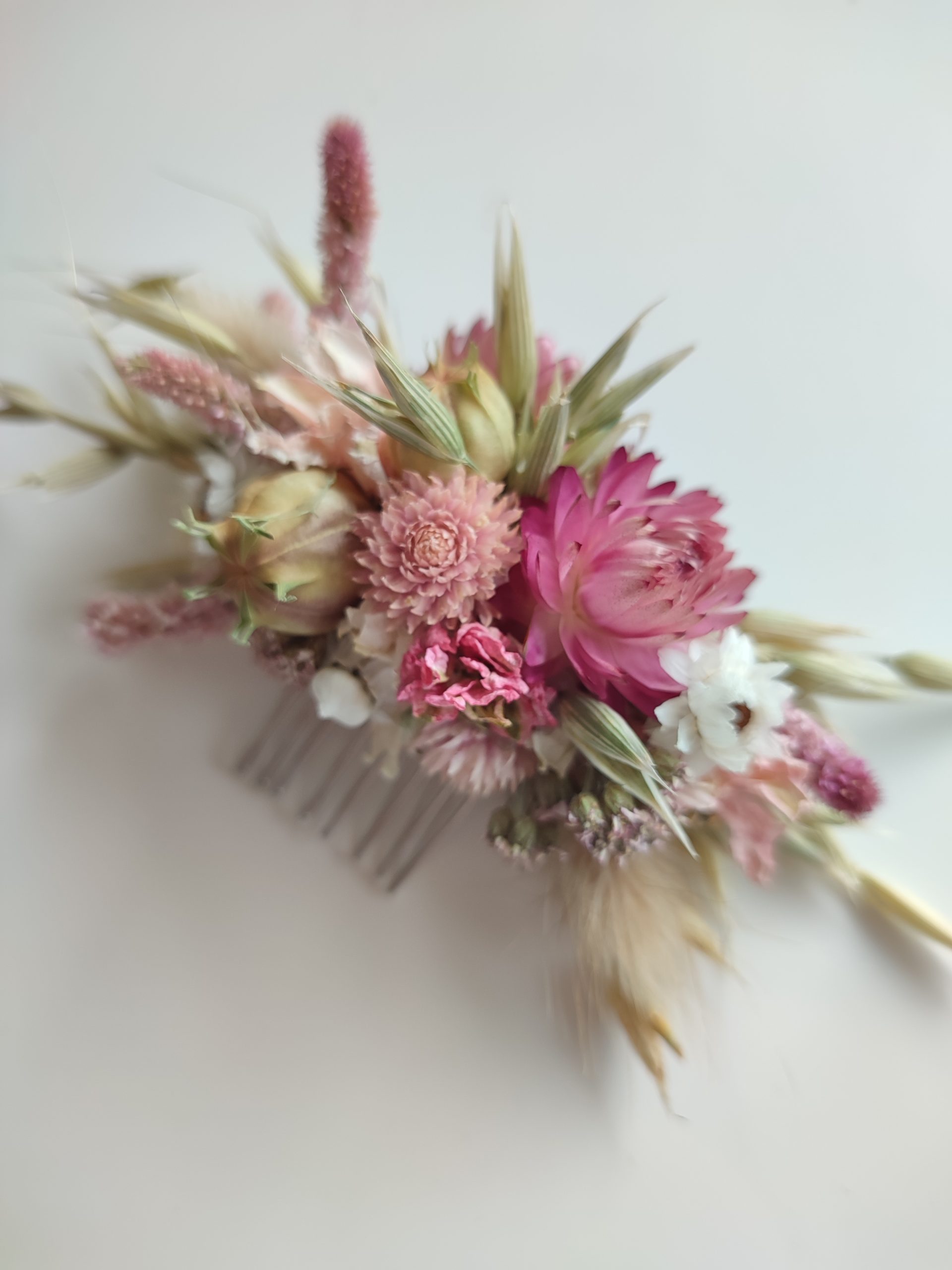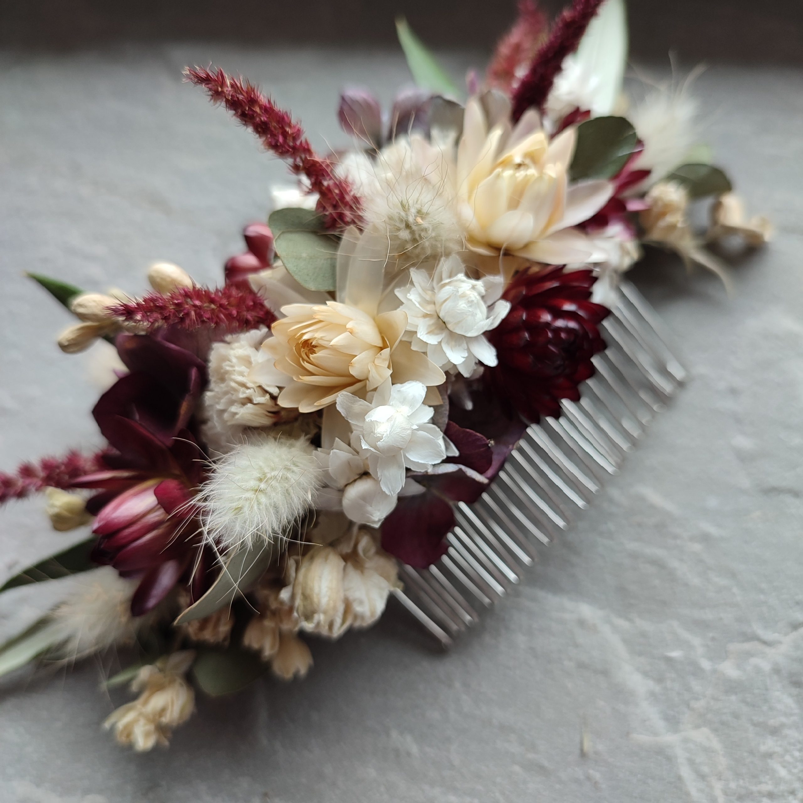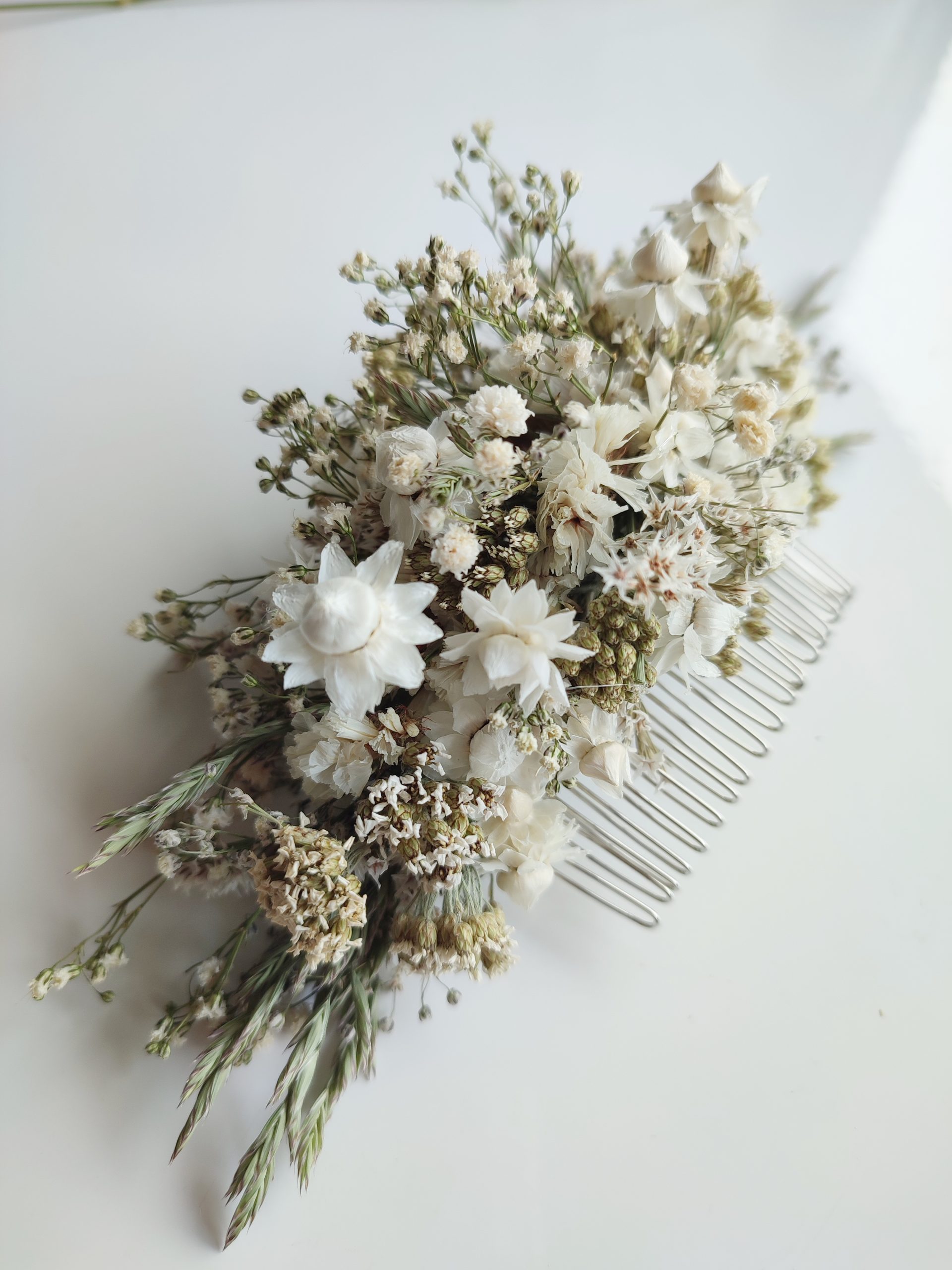 The flowers are wired carefully onto the comb. All my hair combs are made on metal combs either silver or gold coloured.