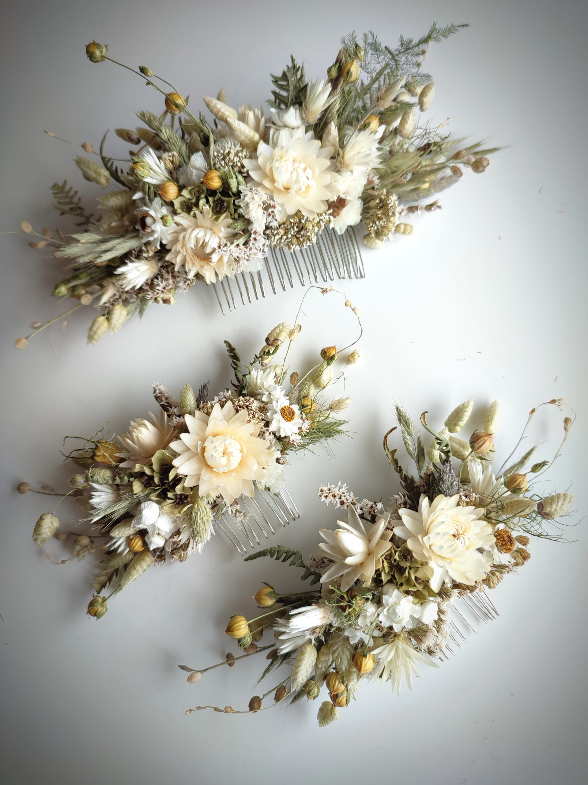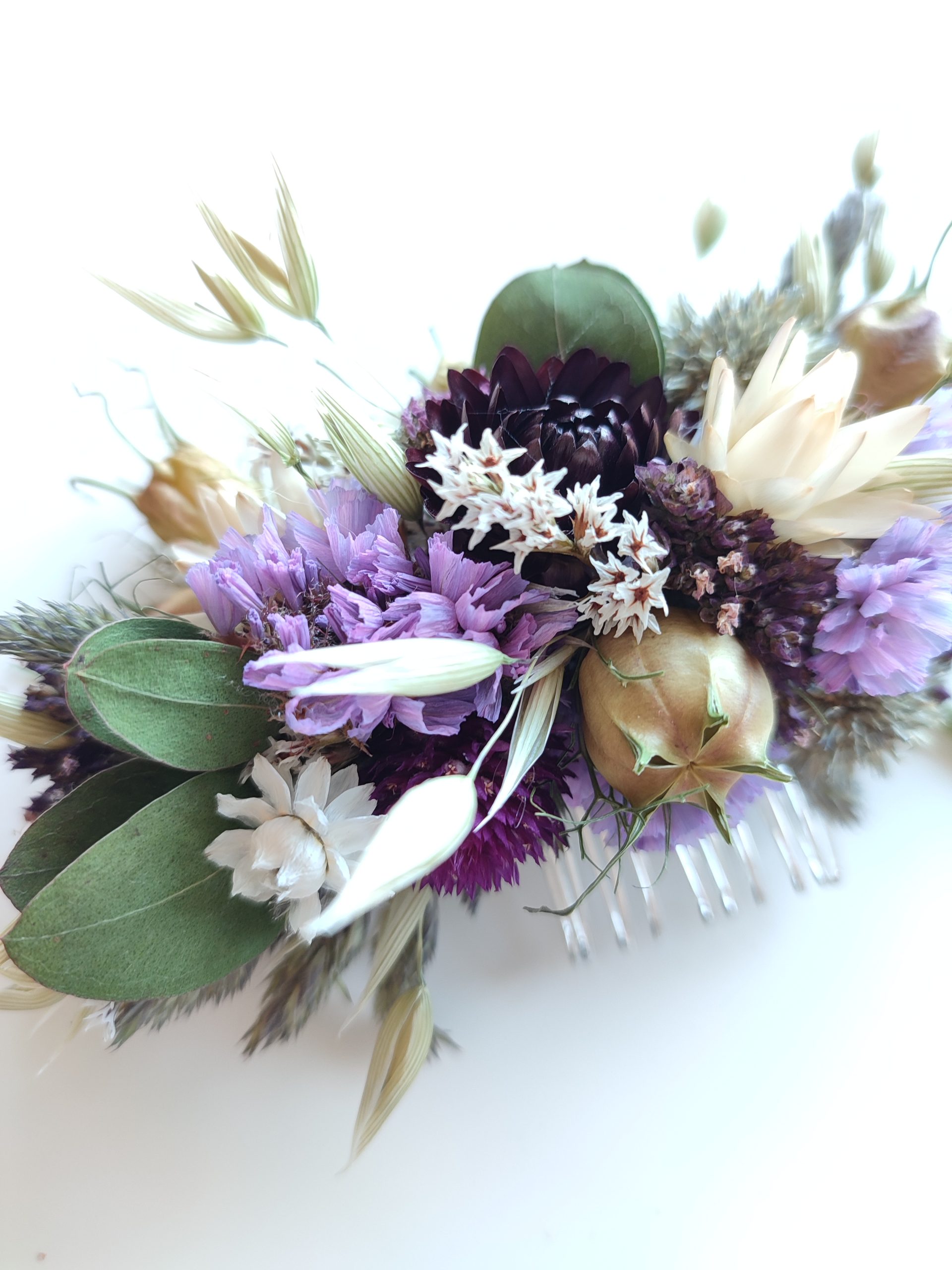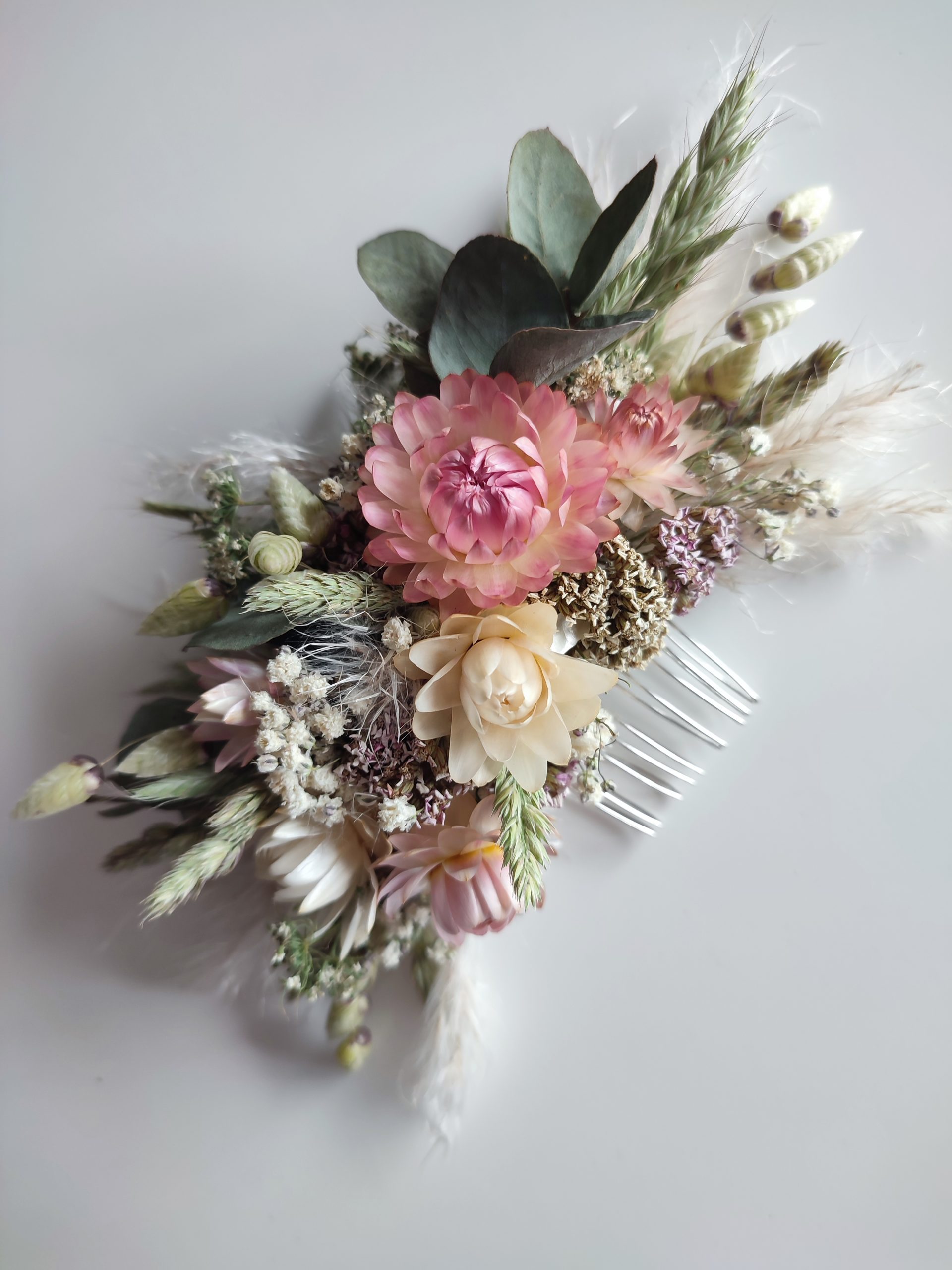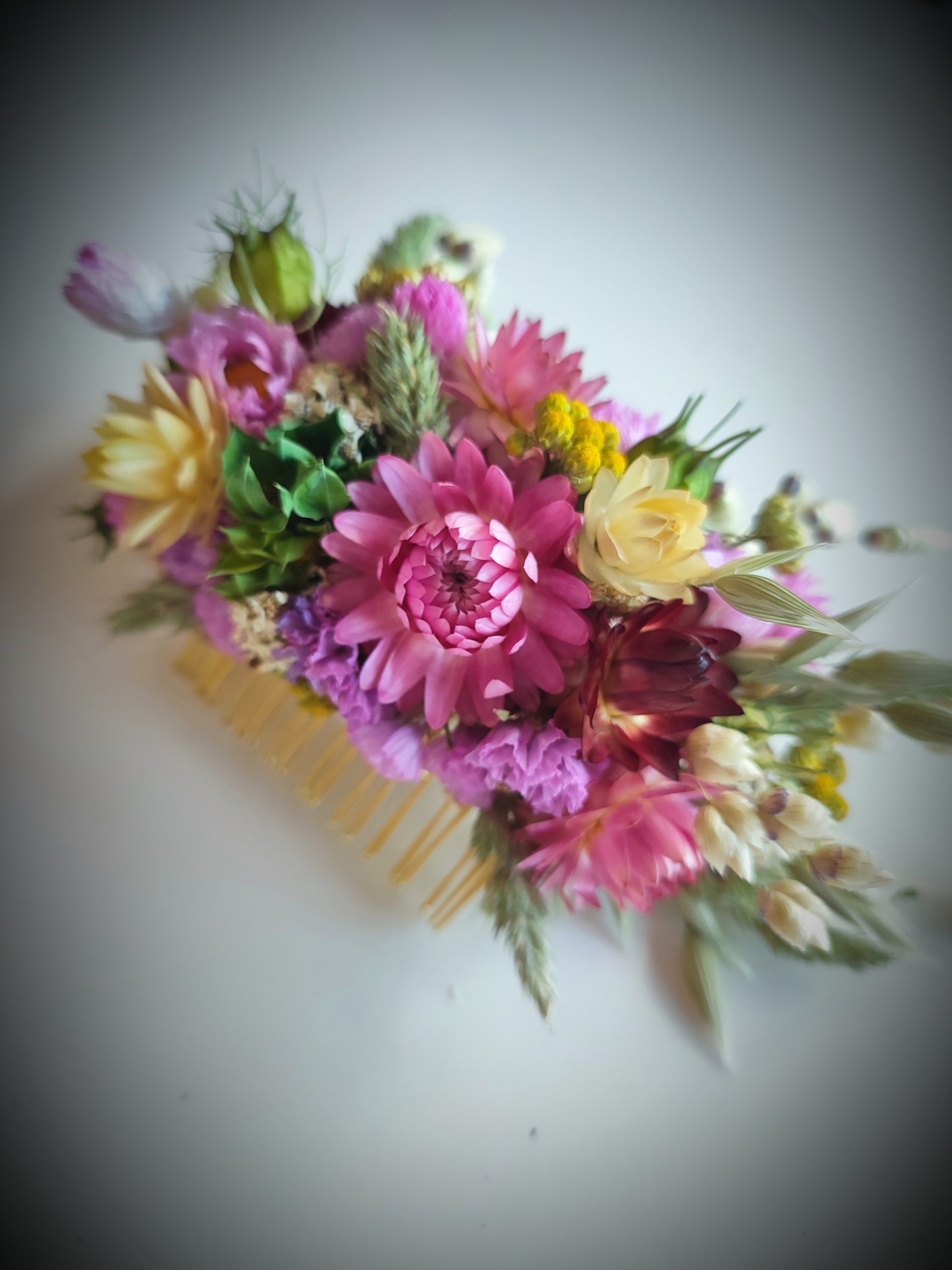 The flowers are wired carefully onto the comb. All my hair combs are made on metal combs either silver or gold coloured.