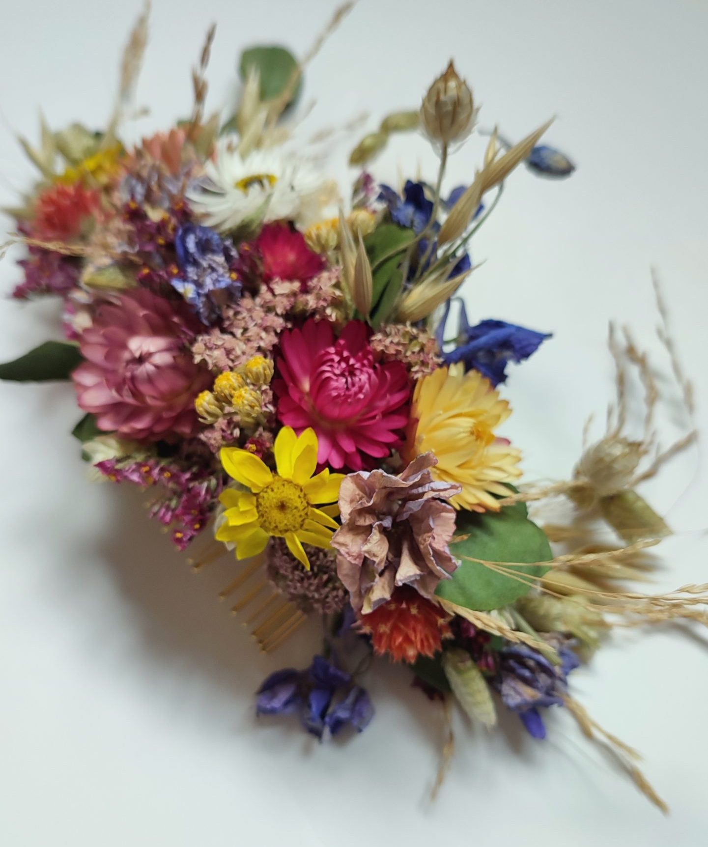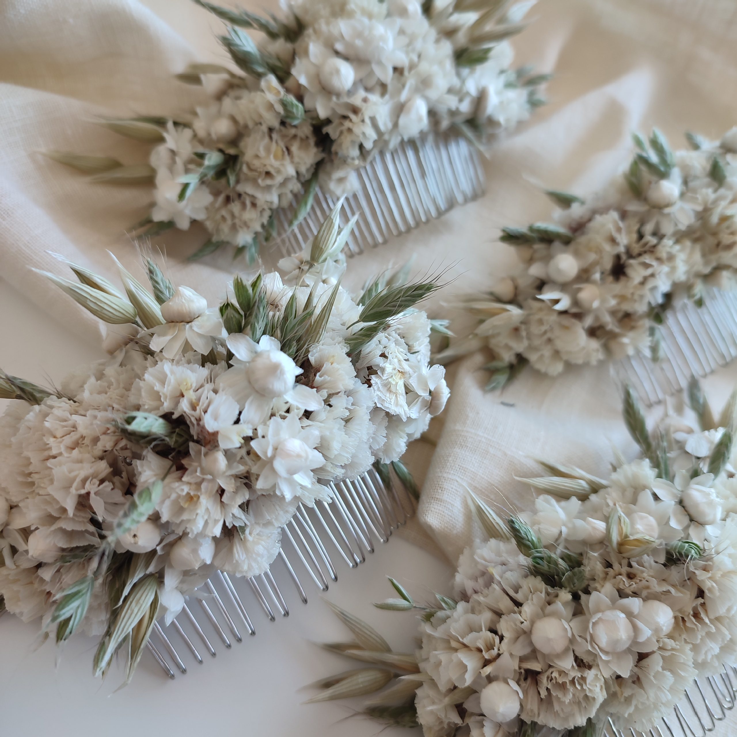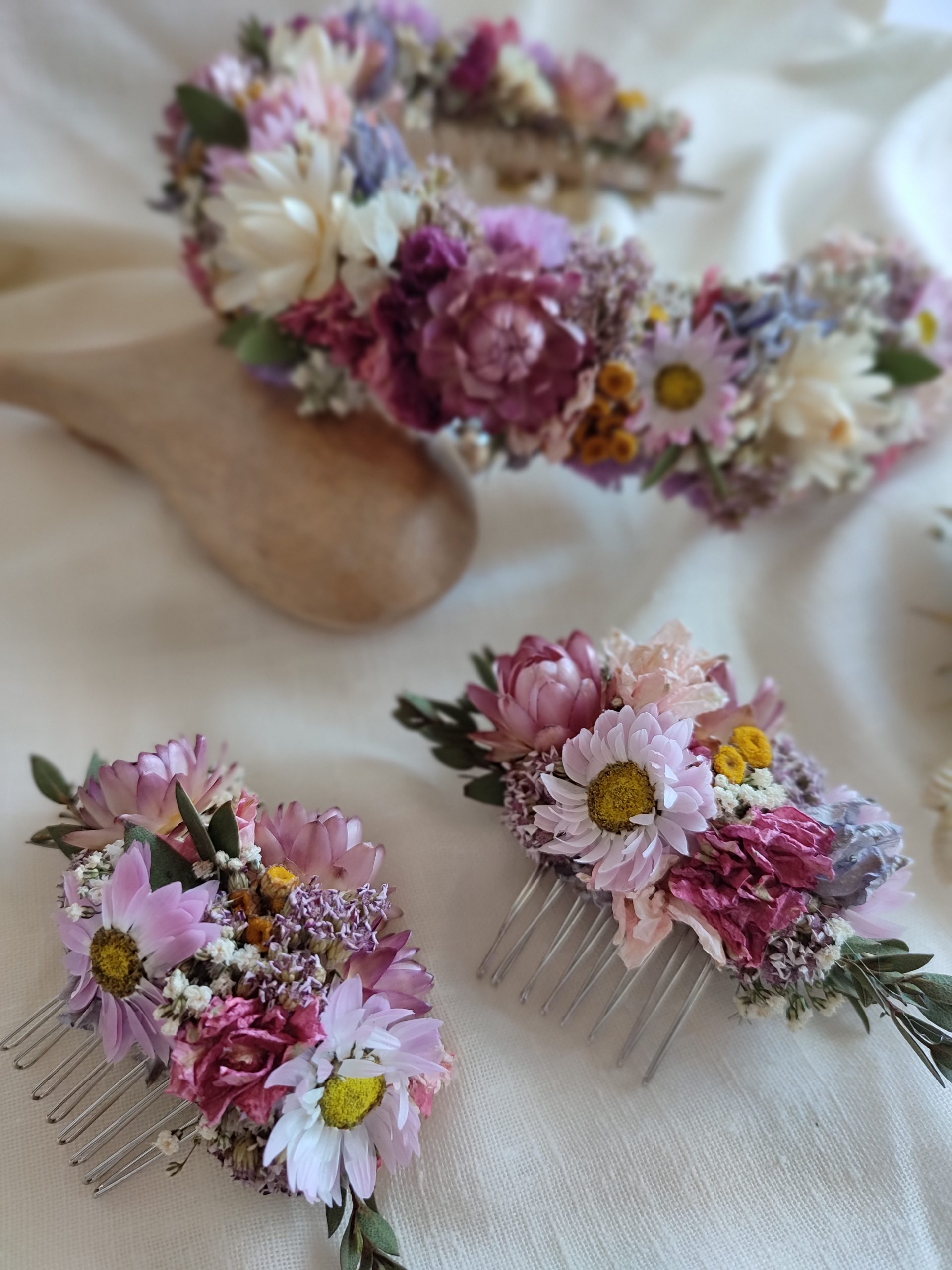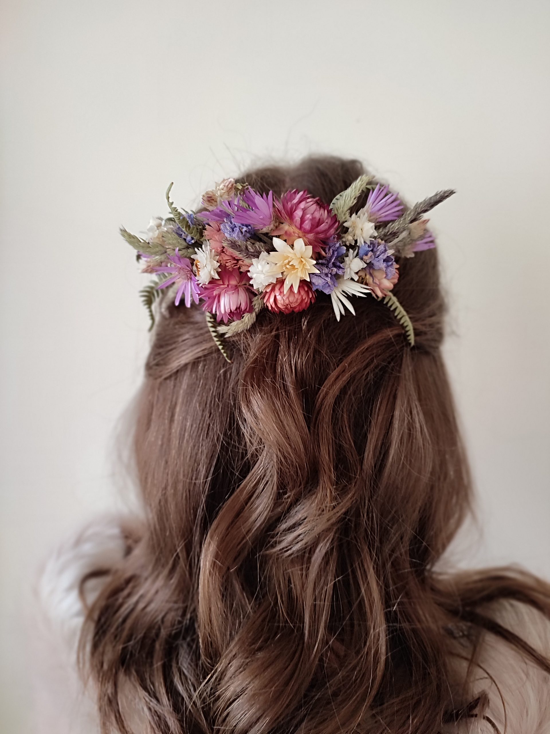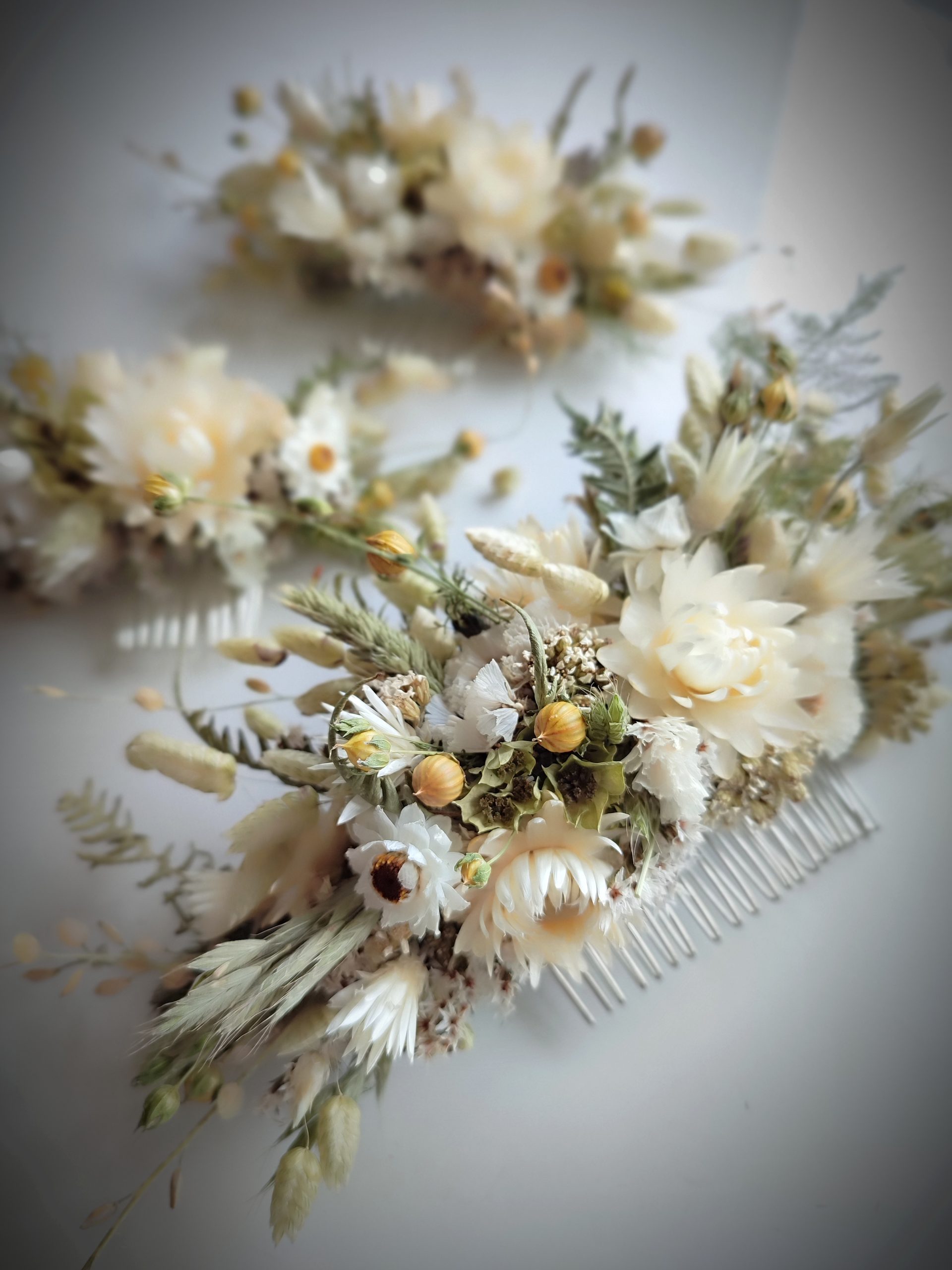 The flowers are wired carefully onto the comb. All my hair combs are made on metal combs either silver or gold coloured.